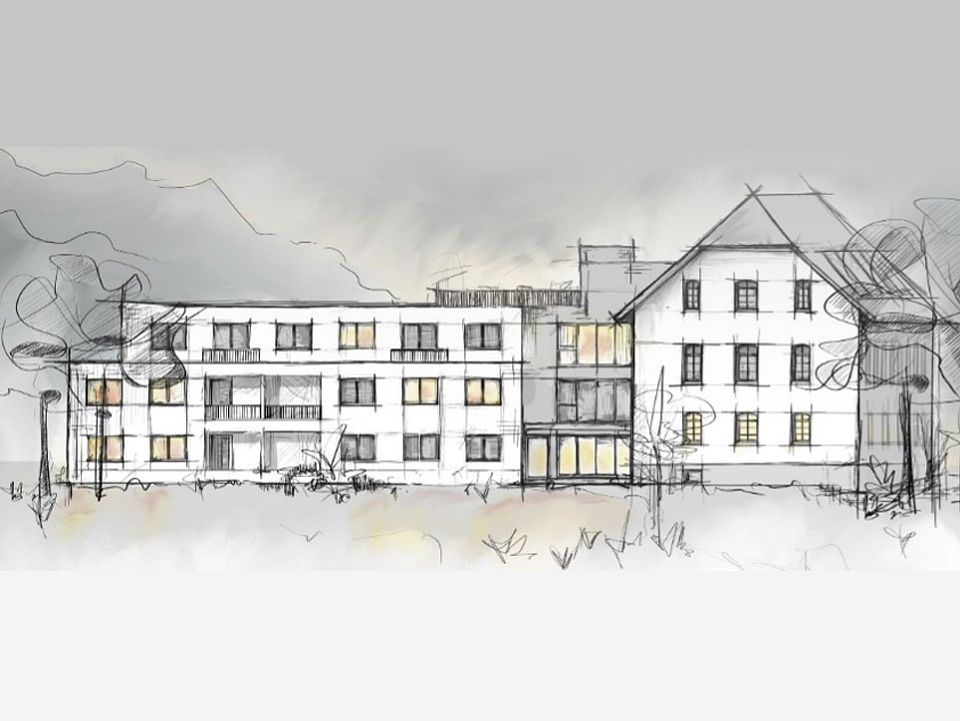 Im Bestandsbau entstanden neue Räume für unsere sozialen Dienste: Im Erdgeschoss befinden sich Hausnotruf, Migrationsberatung sowie Schulbegleitung; der zweite Stock beherbergt den ambulanten Pflegedienst.
